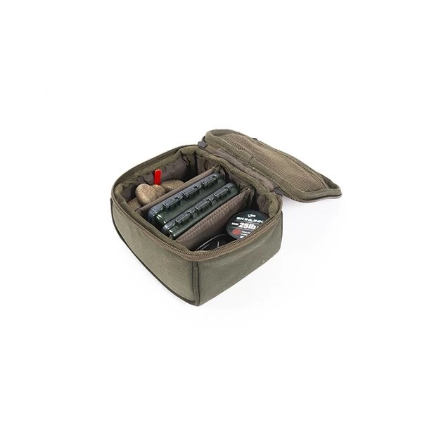 Gevoerde tas voorzien van rits in de bovenflap met handvat en dubbele verplaatsbare tussenschotten. Interne zak van gaas met ritssluiting onder de bovenflap. Hierin passen drie Small Pouches.