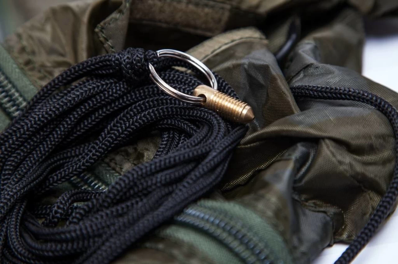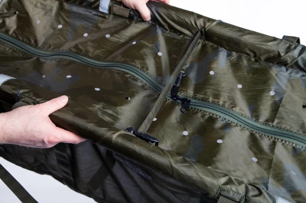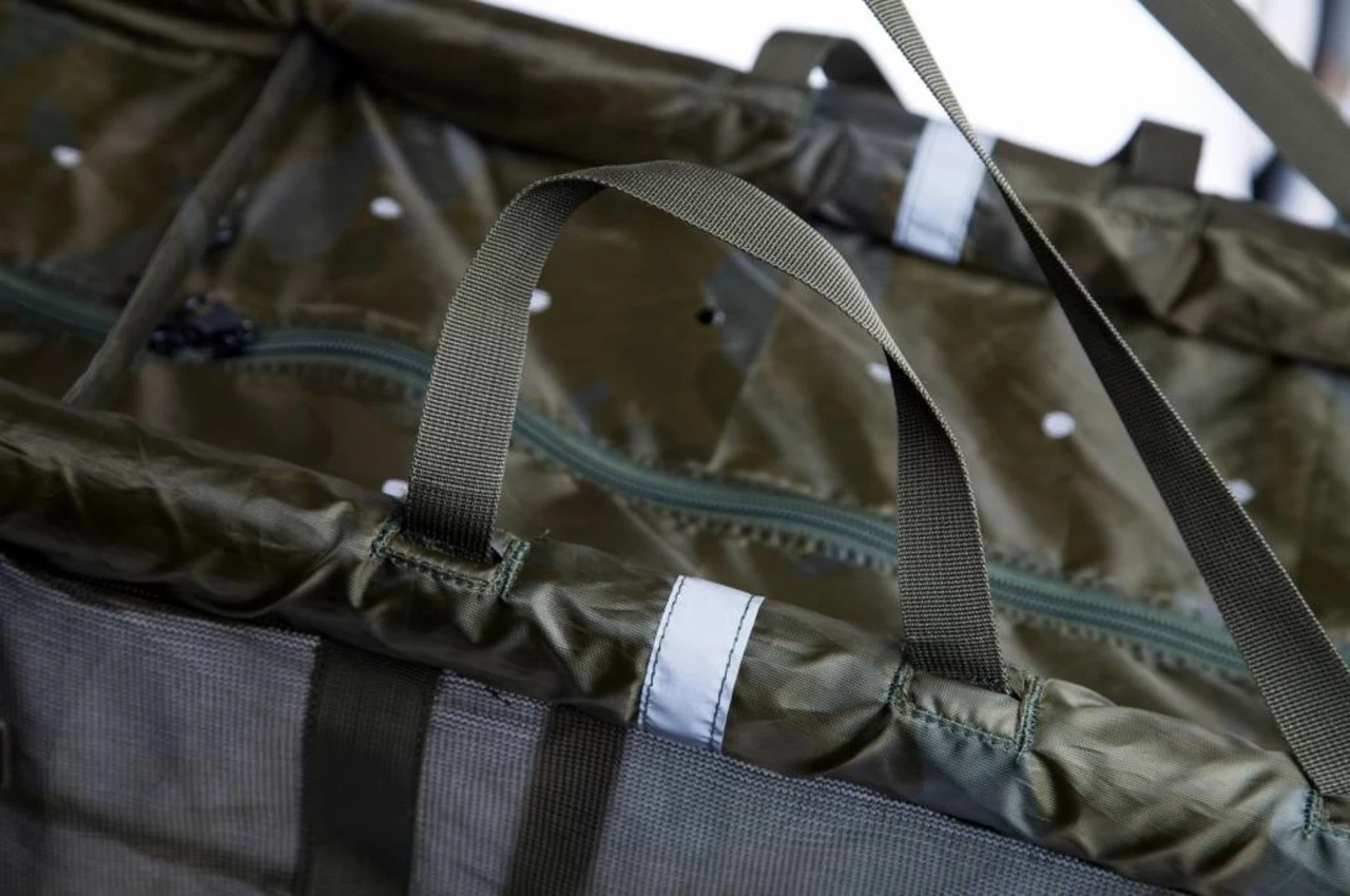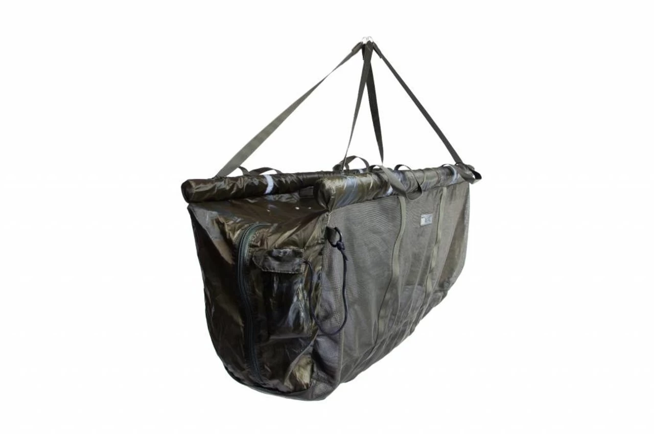 Lichtgewicht ontwerp voor eenvoudig wegen Snel water afvoerende mesh bodem en zijkanten Camouflage materiaal om de vis kalm te houden Grote no 10 ritsen met zip-clip 5 m koord met bankstickbevestiging Tension bar om sneller de weighsling weg te hangen en weer uit het water te halen Dubbele versterkte handgrepen en banden Makkelijk te gebruiken weeglussen Brede weeglussen voor een betere balans Draagtas met trekkoord Vier reflecterende strips